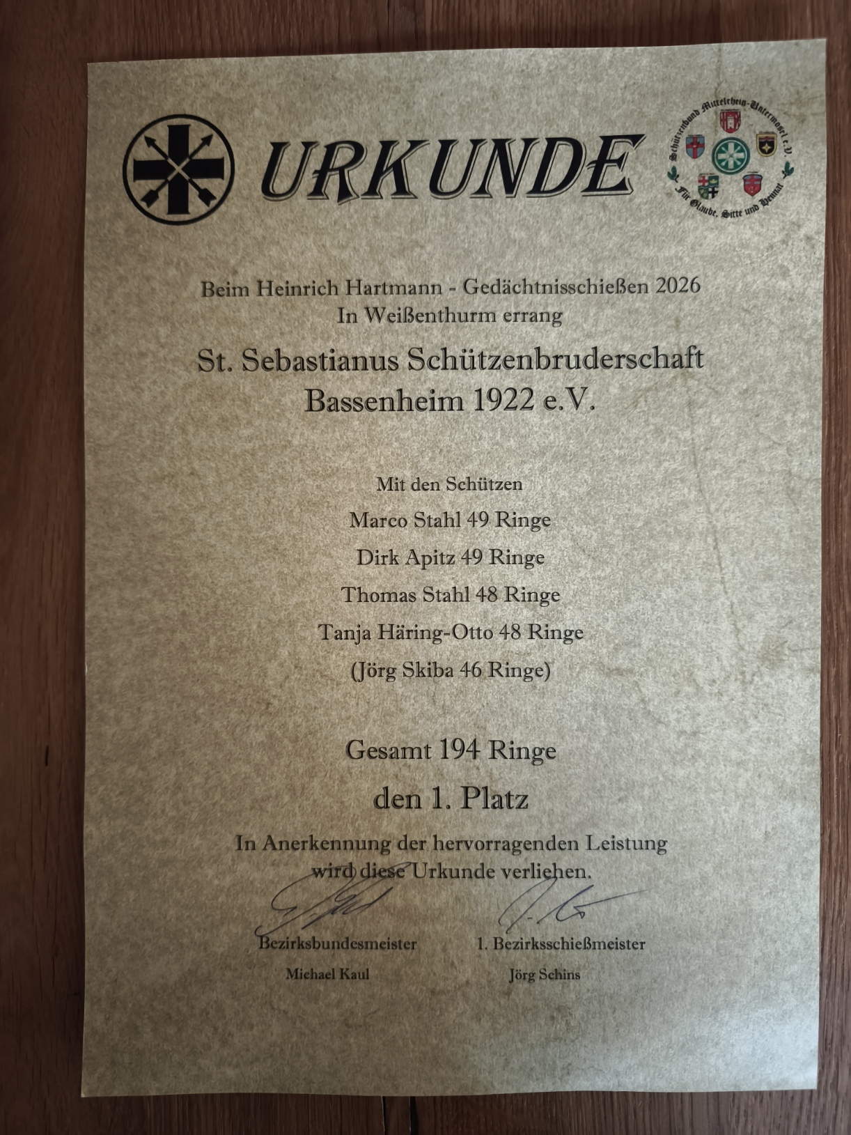 Bassem gewinnt am Wochenende in Weißenthurm mit 194 Ringen das Hartmann Schiessen und holt die begehrte Trophäe nach 2023 wieder nach Bassenheim in die heimische Halle. In der Besetzung Tanja Häring-Otto, Jörg Skiba, Marco Stahl, Thomas Stahl und Dirk Apitz setzen wir uns vor Lay und Niederwerth mit jeweils 192 Ringen durch.
