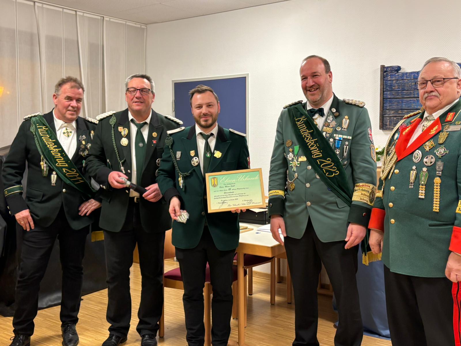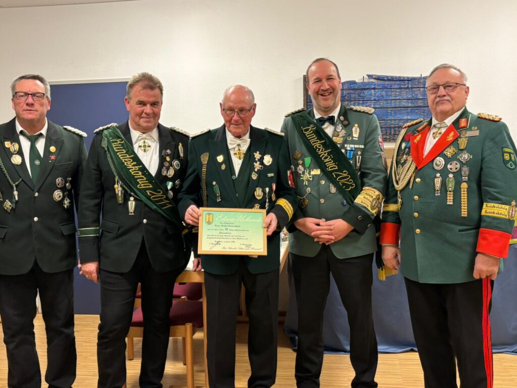 Philipp Hirsch wurde zum Unteroffizier befördert, Lars Krämer und Jörg Skiba erhielten das silberne Verdienstkreuz. Marc Ketzner erhielt den hohen Bruderschaftsorden. Marco Stahl wurde für 25 Jahre und sicherlich als Highlight wurden Hugo und Herbert Braunschädel für nahezu unglaubliche 75 Jahre Mitgliedschaft geehrt. Hier die Verdienste für die Schützenbruderschaft aufzulisten, würde sicherlich den Rahmen sprengen.
